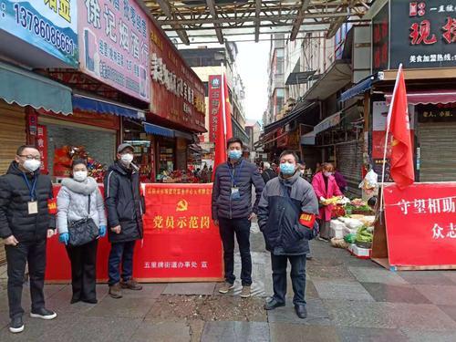 “先生你好,疫情防控期间请佩戴好口罩”、“女士,我给你测一下体温”、“王老板,新年好!你春节在哪过年的,有没有与武汉过来的人接触,有没有与新冠肺炎确诊人员或疑似人员接触,有没有.....”市场中心五里牌党支部的党员干部正一次又一次的做这这段时间天天做着的相同工作。五里牌农贸市场作为中心城区的主要农贸市场,承担着近10万居民的柴米油盐。五里牌农贸市场开着门,周边居民就安着心,为了保障市民的蔬菜、粮油能正常采购,五里牌市场管理所党支部在市场入口设立党员示范岗,严防严控将新冠病毒“堵死”在市场外,确保市场能安全运营。