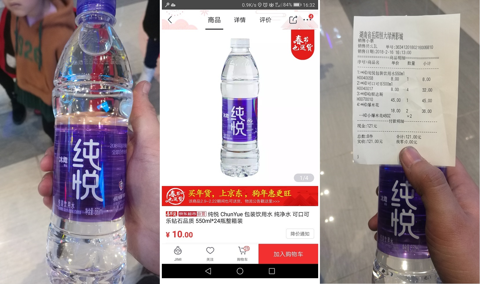 本人与2018年2月15日(正月初一)到位于高铁站附近的恒大绿洲影院看电影,因周边没有商超开门,只能在电影院内购买饮料。电影院的饮品高于一般市场零售价是常态,比如500ml装可乐、芬达等,一般超市大约3-4元一瓶,影院翻倍卖到8元一瓶,这个我也能理解,但是这里销售的最基础的纯净水,也就是可口可乐冰露纯悦550ml装,市场价1-1.5元,一般批发价0.8-0.9元/瓶,网店促销售价甚至低于0.5元/瓶,这里却也要卖到8元一瓶!至少翻了8-10倍!!这真的合理麽?? |