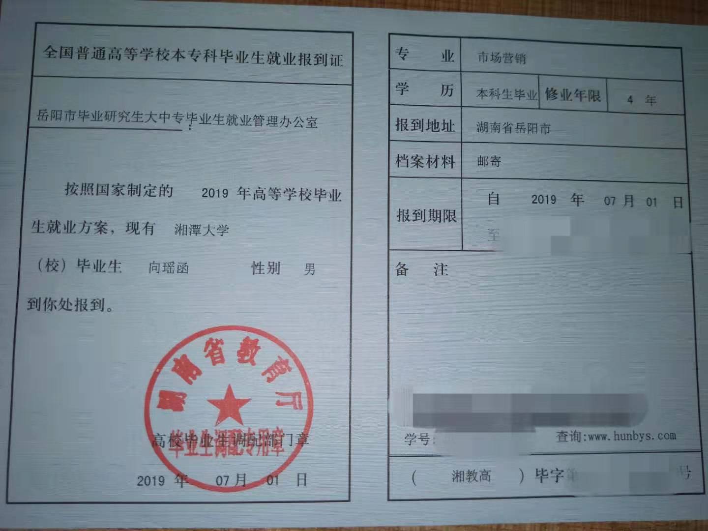 附件2:向瑶函的报到证反面-15574398238-湘潭大学15届.jpg